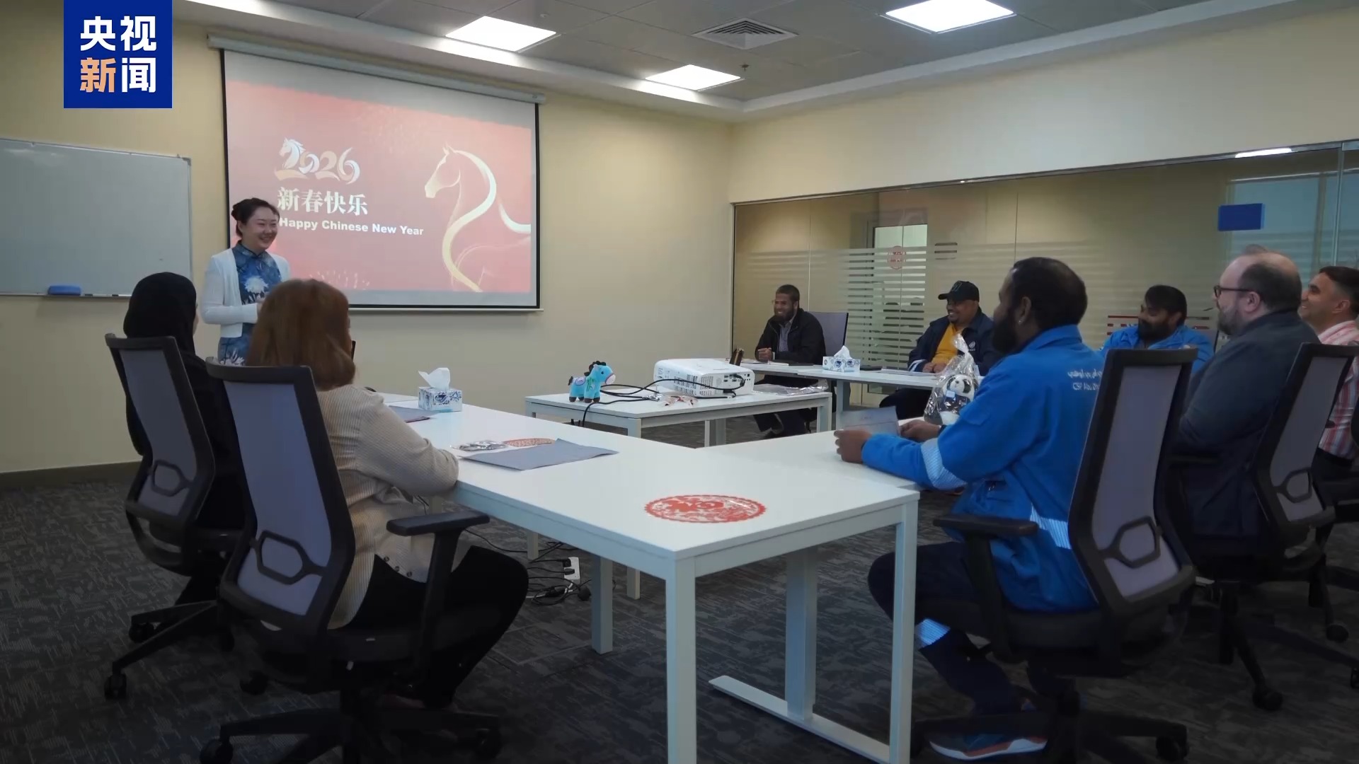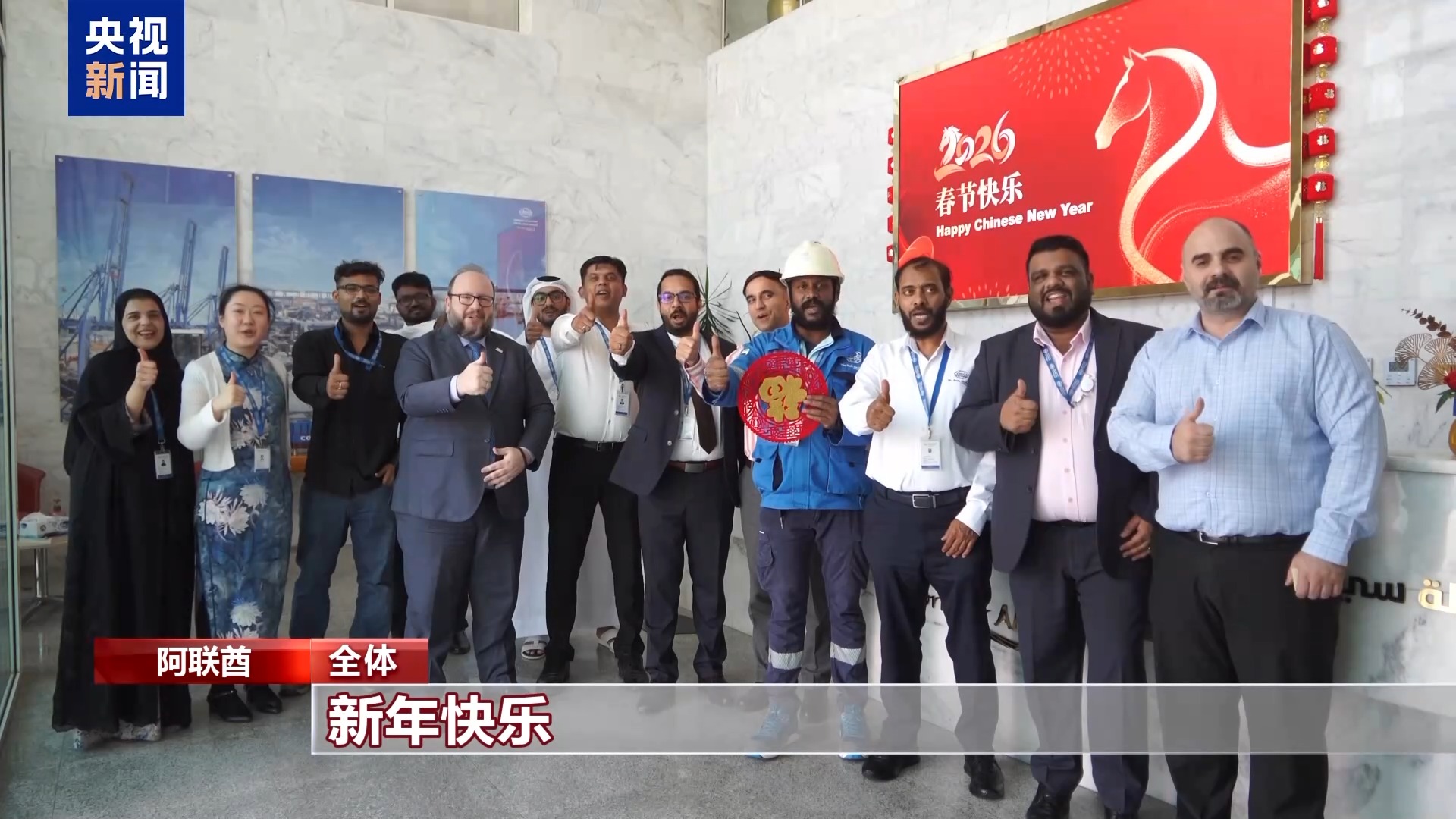 如今,阿布扎比码头拥有来自15个国家和地区的210名员工,多元文化在这里交融共生。在马年春节到来之际,码头办公区张灯结彩,员工们贴起了“福”字,共庆新春佳节。